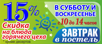 Счастливые часы: На блюда горячего цеха скидка 20% с понедельника по пятницу«Счастливые часы»: На блюда горячего цеха скидка 20% с понедельника по пятницу с 10.00 до 17.00*. *Скидки действуют только на блюда горячего цеха. На пиццу скидка не распространяется.Скидки не суммируются. Скидка не действует в праздничные и предпраздничные дни.